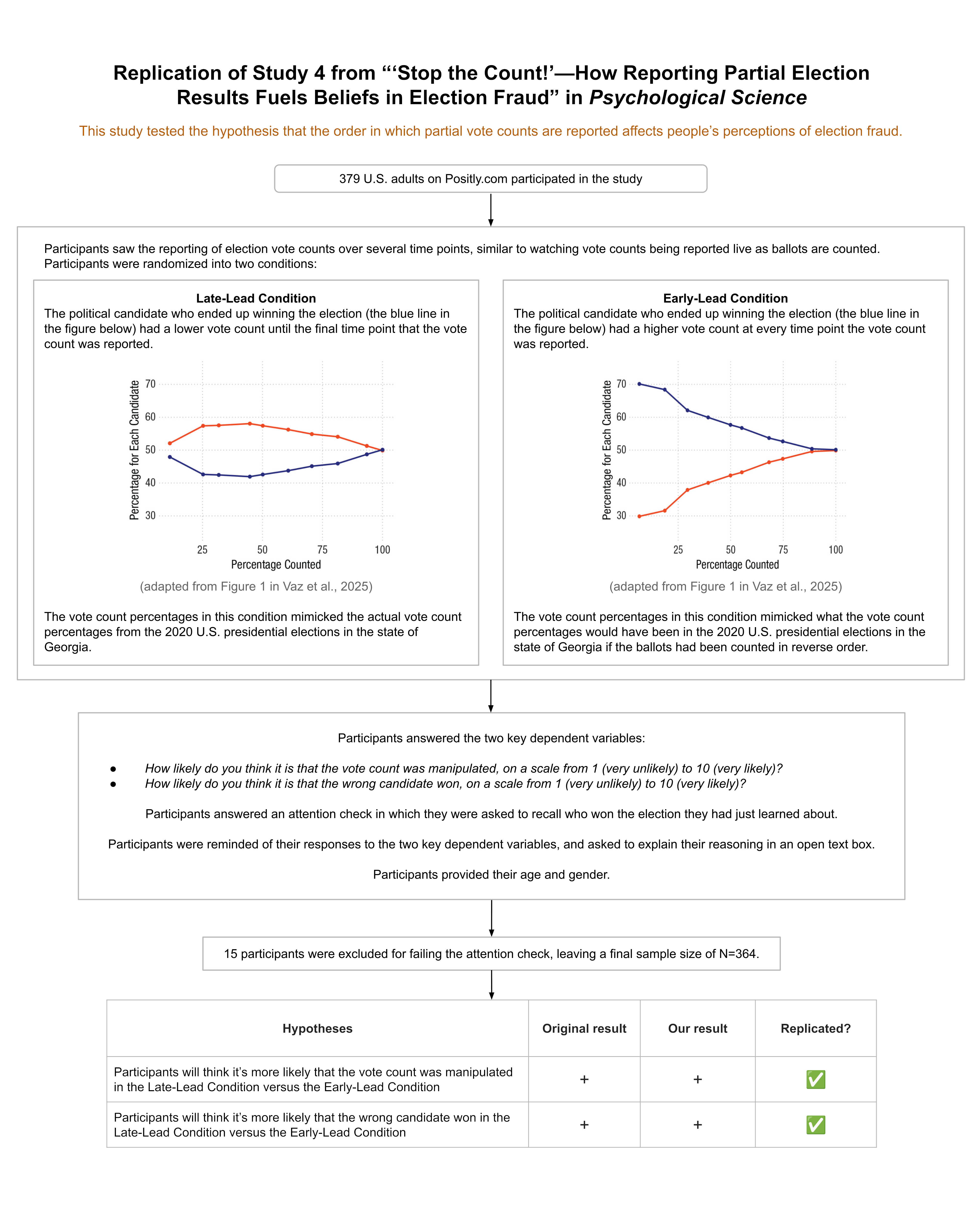 How to cite this replication report: Transparent Replications by Clearer Thinking (2025). Report #14: Replication of a study from “‘Stop the Count!’—How Reporting Partial Election Results Fuels Beliefs in Election Fraud” (Psychological Science | Vaz et al 2025) https://replications.clearerthinking.org/2025psci36-8