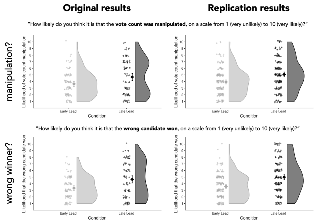 The results from the original study confirmed the authors’ predictions: When the winning candidate took a late lead versus an early lead in the partial reported vote counts, participants were more likely to think that election fraud had occurred and that the wrong candidate had won.