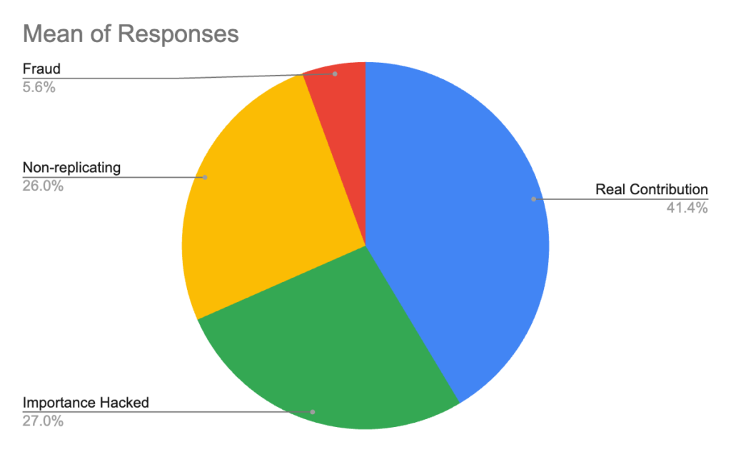 It is worth noting that the percentage of papers that participants believed would replicate in these questions (the Importance Hacked and Real Contribution categories combined), was about 68%, which is 13 percentage points higher than the 55% participants said would replicate in response to the earlier question in this survey asking what percentage of studies published in the top 5 journals in the last 12 months would replicate. It seems possible that this question prompted more thorough reflection because participants’ answers needed to sum to 100%, and the category of Importance Hacking for studies that would replicate but still didn’t make a real contribution was explicitly introduced, and that difference in context may explain the discrepancy.1