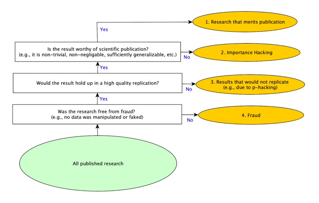 2. Real Findings that Lack Merit for Publication due to Importance Hacking– studies that report findings that *would* replicate, but the paper obscures the fact that the findings reported are not worthy of publication